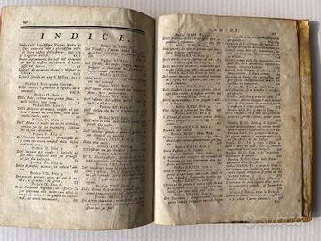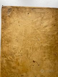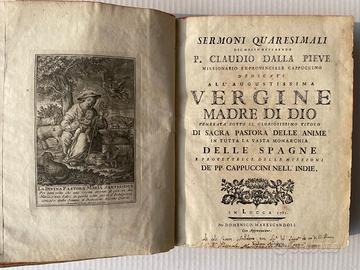 ... reverendo P. Claudio Dalla Pieve, Missionario Extraprovinciale Cappuccino, dedicati all'Augustissima Vergine Madre di Dio, venerata sotto il gloriosissimo titolo di Sacra Pastora delle Anime in tutta la vasta monarchia delle Spagne e protettrice delle Missioni de' PP. Cappuccini nell'Indie. In Lucca : per Domenico Marescandoli, 1781 Legatura tutta pergamena, coeva, salda, con titoli ms. sul dorso. XXVIII, 440 pagine, tagli rossicci, pregevole antiporta calcografica ; in 4º (26,5 cm. x 21) Pagine fresche, fruscianti, no gore; pallido ingiallimento solo su una decina di pagine; firma di appartenenza sulla prima guardia, e in calce al prontespizio (vedi foto); sul piatto posteriore modesto innesto pergamenaceo (vedi foto). Esemplare in ottimo stato, malgrado i suoi 245 anni.