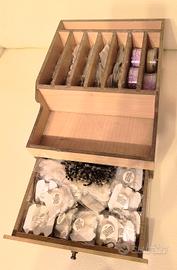 Un contenitore in legno con fili, ganci etc