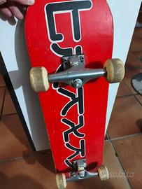 In vendita questo autentico skateboard completo, pezzo vintage ideale per collezionisti o appassionati. Il deck presenta una vivace grafica rossa con un logo nero/bianco dallo stile retro. È completo di truck in metallo e ruote, pronto per l'esposizione o l'uso (con eventuali regolazioni necessarie data l'età). Presenta normali segni d'usura sulla tavola e sul griptape, che ne confermano l'autenticità e il vissuto. Perfetto per chi cerca un oggetto con storia e carattere.