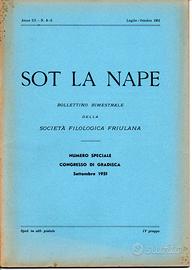 SOT LA NAPE 1949 Rivista di lingua, letteratura, arti e tradizioni popolari della Società Filologica Friulana. In italiano e friulano. Da n.1 del 1949 al 2016, circa 200 numeri più vari sfusi, meno 1949 (4,5,6), 1950 (4, 6), 1951 (1,2,3,6), 1953 (1,2,5,6),1954, 1955 (1,3), 1956 (4), 1957 (1), 1961 (1), 1962 (1), 1982 (1,3),1984 (1), dal 3 2013, 2014 1,2, In blocco. Spese postali, circa 40 euro, a carico dell’acquirente. Invio per poste delivery Express. Oppure ritiro in loco.