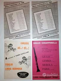 Lotto di 11 spartiti vintage per orchestra a Euro 30, di seguito i titoli: Musica e allegria, periodico musicale N° 12 con musiche di Andrea Galassi. 2 nuovi successi di Steve Happel and His Orchestra "EI Patio/Poncho" (Edizioni Ottavo Nano). Cifolina/Hello (Edizioni Ottavo Nano). La Pippata/La Corrida (Edizioni Musicali 2000). Traneo/Canarias (Edizioni Musicali Fulgor). I Ragazzi dell'Adriatico "Due Amanti/Dimmi Amore/lo e Te"(Edizioni Musicali MIE). Serie Canzoni "Sonobun Barbone/ Volevo solamente Te"(Edizioni Musicali Euterpe). Serie Carattrristica 6ª Edizione éEl Cafetero/Fiesta Gitana"(Edizioni Musicali Euterpe). Musica per sognare "Addio.../Stanotte cerco un cuore"(Edizioni Mantellini). 7 Successi da ricordare 'Per vivere/ Tromba triste/Torniamo al mare/No! No!/ll nostro Tango/Vaise vuoi/Finalmente"(Edizioni Musicali MIE). Folk Emiliano Romagnolo "La Mazurca del bacio"-"Arrivederci amore"(Edizioni Musicali Filmer). Secondo lotto di 5 spartiti musicali serie Tanghi a Euro 15, di seguito i titoli: Serie Tanghi Edizioni Euterpe (Distancia/Locura). Serie Tanghi Edizioni Vela(Te amo siempre/Remordimiento). Diluvio/Classico Tango/Controluce/ Venturas Edizioni Vela. Due Tanghi Argentini di sicuro successo Edizioni Musital (Beso de Amor/Furore). Serie Tanghi di grande successo Edizioni Filmer (Original Tango/ Argentina). Terzo Lotto di 4 spartiti musicali vintage, perlopiù clarinetto e sax, a Euro 10. Di seguito i titoli: Album tradizionale n° 5- Folk per clarino SI b (Edizioni Vela). Album tradizionale n°5- Folk per sax/contralto MI b (Edizioni Vela). 4Successi di anni Catellani "Cabana/Aé...! Aé...!/Fidelio/Linda Hermosa (Edizioni Musicali Stop). Giulio Chiappinellipresenta Speciale per Clarinetto in Sl b e orchestra" Giulia/Gemma/Merola/Paisà (Edizioni Musicali). Oggetti usati e ben conservati con inevitabili segni del tempo. Preferibile il ritiro in negozio, per eventuale spedizione, foto o informazioni in merito possibile contatto telefonico al 3334779624.