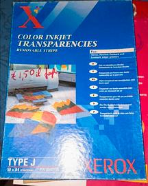 Xerox Colour Inkjet Transparencies: Fogli trasparenti specifici per stampanti inkjet (Xerox, Hewlett Packard e Lexmark) con una striscia rimovibile, ideali per presentazioni o progetti creativi.