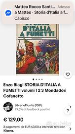 Bellissima edizione in tre volumi curata da Enzo Biagi, formato gigante(Tipo enciclopedia) sulla storia d’Italia dall’antica Roma al XX secolo. Creata nel 1978 dal famoso giornalista Enzo Biagi e disegnata dai migliori fumettisti italiani, a me è stata più utile della scuola per imparare la storia del nostro paese, mentre per un collezionista è un gran bel pezzo di storia del fumetto italiano! Arnoldo Mondadori Editore