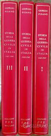 "Storia della guerra civile in Italia (1943-1945)" di Giorgio Pisanò (giornalista e politico), un'opera monumentale in tre volumi che rappresenta una delle più note ricostruzioni storiche del periodo dal punto di vista della destra italiana. L'opera documenta gli eventi della Guerra Civile italiana con migliaia di episodi, molti dei quali inediti all'epoca della pubblicazione. Pubblicata tra il 1965 (Volume Primo) e il 1966 (Volume Secondo e Terzo) dalla casa editrice FPE (Finozzi) di Milano. Formato: Tre grandi volumi rilegati con copertina rigida rossa e scritte in oro, per un totale di circa 1860 pagine. Dimensioni di ciascun volume: altezza cm. 32 - larghezza cm. 24 - profondità cm. 5. Peso: kg. 6,00.