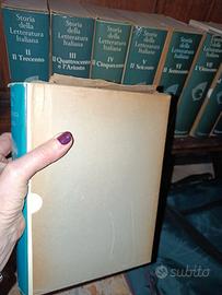 Storia della letteratura italiana dalle origini al Novecento. Nove volumi, ogni volume con ancora scatolo originale, sovracoperta illustrata e copertina rigida verde. Tutto in ottime condizioni. Solo il volume VII manca di cartone e la sovracoperta è un po' rovinata. Stampato dal 1965 al 1969.