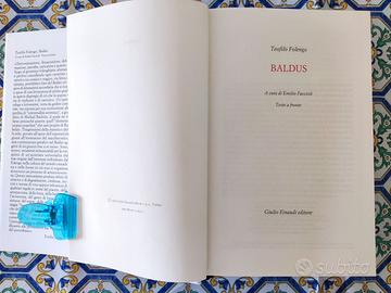 il capolavoro del benedettino girovago Teofilo (Gerolamo) Folengo (Merlin Cocai, 1491-1544) e culmine della poesia in latino maccheronico, caratterizzata dalla "ironia fagocitante" (C. Segre). Il BALDUS fu scritto in più redazioni nella prima metà del Cinquecento ed è riconosciuto quale precursore e fonte delle successive opere di F. Rabelais, descritte magistralmente dal critico russo M. Bachtin. Questa è la preziosa e ormai introvabile edizione curata da Emilio Faccioli per Einaudi nel 1989, in cofanetto di cartoncino rigido.