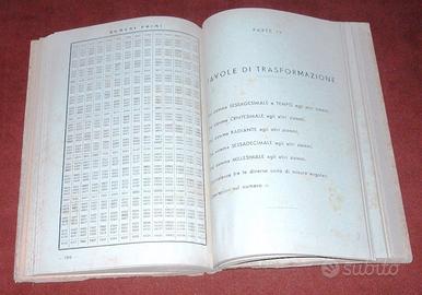 Titolo: Nuove Tavole Logaritmiche con cinque decimali (per i sistemi: sessagesimale, centesimale, sessadecimale) - Tavole Aritmetiche, Tavole Finanziarie - Valori Naturali ad uso dei Licei Scientifici e Classici Autore: Prof. Ing. Clemente Bonfigli Editore: Ulrico Hoepli Editore Milano Anno: 1944 Dimensione: 20x13.5 cm circa Stato: ottimo Come spiega l'autore nella prefazione di questo libro, il volume e' indirizzato non solo agli studenti dei Licei Scientifici ma anche agli studenti delle diverse Facolta' universitarie e dei Politecnici di Ingegneria, Architettura, Agraria etc. Sono state introdotte, rispetto a testi simili, alcune innovazioni che si sono rese necessarie in seguito al notevole sviluppo preso dalle applicazioni della divisione centesimale del quadrante nella misura degli angoli, introdotta fin dal secolo scorso (il libro e' del 1944) anche in molti strumenti di costruzione nazionale. Sono state introdotte insieme alle tavole logaritmiche: > le tavole aritmetiche solite comprendenti i quadrati, i cubi, le radici quadrate e cubiche e cosi' via > le tavole dei valori naturali con 4 decimali per gli angoli sessagesimali > le tavole con 8 decimali dei principali coefficienti utili nelle applicazioni della matematica finanziaria, della ragioneria, dell'estimo libro libri scienze matematica antico