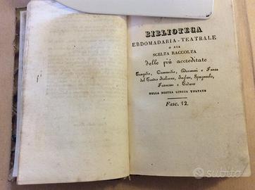 Volumetto in mezza tela e cartonato rigido PP 111. Inoltre: biblioteca ebdomadaria fasc. 12-138+34 Teatrale - Il ritorno del coscritto B. Fiboli - La bella Prussiana di H. Dupin e A. Dartois 1834 pp. 90 + Carlo XII parte terza e ultima - La Fiera delle fate Visaj 1830 pp. 95 - Il solitario Corrado Vergnano - La scommessa 1832 pp 96.Buone condizioni generali, solo una sbucciatura nella tela su dorso, segni del tempo come da foto ed alcune pagine con fioriture d'acqua. Cm 9x14,2