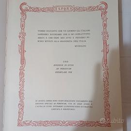 Vendo 2 testi, edizioni limitate , Dino Editore, a cura di Duilio Susmel. Il primo, edizione di lusso (Un uomo chiamato Mussolini) ed il secondo edizione gran lusso ( Mussolini nostro padre) a tiratura limitata 999, esemplare N° 661 di 999, autografata dall'Editore. Acquistati da mio nonno (conservo bolla) nel 1989, mai usati ,come nuovi.