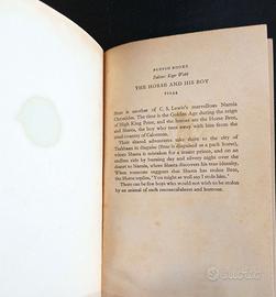 "The horse and his boy" di C.S. Lewis, illustrato da Pauline Baynes (libro del ciclo di Narnia). Prima edizione Puffin / seconda stampa del 1966 in condizioni discrete. Danno da macchia nella copertina e nelle pagine adiacenti (vedi foto), ingiallimento delle pagine e segni dell'età.