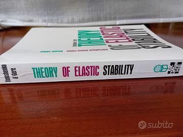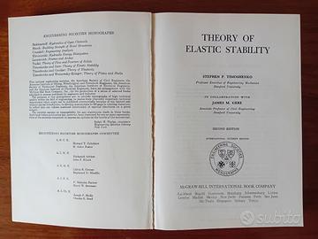 Timoshenko & Gere, Theory of Elastic Stability International Student Edition '61. Libro di testo fondamentale per la comprensione dei fenomeni di instabilità elastica e anelastica di travi, superfici aperte e chiuse. Seconda edizione del 1961. Il libro in oggetto è in ottime condizioni, copertina semirigida. Si segnalano solo alcune imperfezioni sul primo e secondo risguardo (tracce di adesivi come si evince nella figura 3), e una non perfetta chiusura tra l'occhiello e il primo risguardo (anche questo si nota nella figura 4). Tutte le pagine interne sono in ottime condizione senza evidenziazioni o sottolineature. Lingua Inglese