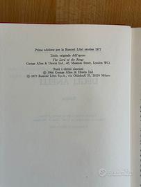 J.R.R. Tolkien. Prima edizione assoluta della versione cofanetto Rusconi, copertina rigida in tela con sovraccopertina, data di stampa ottobre 1977, mappa presente e integra, tagliandino del prezzo presente. Disponibili altri volumi di Tolkien fuori catalogo.