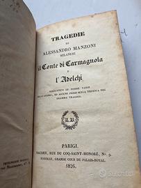Vendo rarissimo volume “Tragedie” di Alessandro Manzoni, edizione originale pubblicata nel 1826 a Parigi da Baudry. Comprende Il Conte di Carmagnola, l’Adelchi, poesie varie e scritti teorici sul dramma tragico.