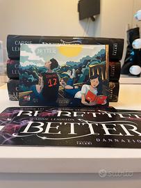 Trilogia "Better" Vendo trilogia completa in buone condizioni generali. Segnalo piccoli difetti: Il primo volume ("Collisione") presenta la prima pagina staccata Il terzo volume ("Ossessione") ha le ultime pagine leggermente ondulate a causa di umidità Per il resto i libri sono integri e perfettamente leggibili.