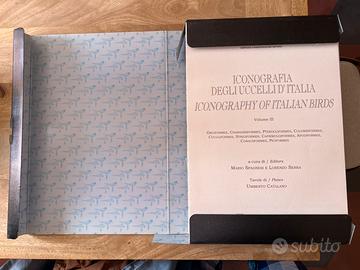 Si tratta di un volume, anzi un folder con volume, di grandi dimensioni: 36x54 riguardante le specie di uccelli in Italia editato nel 2000 dall’allora ministro dell’Ambiente. Contiene 85 preziose riproduzioni di alcune specie di grande formato su carta speciale 34x50, finemente riprodotte. Un volume ornai introvabile.