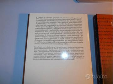 1) Discorsi di Ermete Trismegisto. Corpo ermetico-Asclepio La paternità del Corpo ermetico e dell'Ascepio fu attribuita dalla tradizione al dio Ermes, identificato dai Greci con l'egizio Thot, depositario della sapienza e scriba degli dèi. Eccelso come filosofo per la sua vasta conoscenza. Come sacerdote per la pratica di culti divini e degno del rango regale come amministratore delle leggi, Ermete venne giustamente chiamato "Trismegisto", il "tre volte grande". Di Elaine Pagels: 2) I Vangeli gnostici Nel dicembre 1945, a Nag Hammadi, nell'Alto Egitto, un contadino arabo trovò seppellita nella sabbia una giara di terracotta rossa contenente tredici volumi di papiro rilegati in cuoio. Erano i testi sacri di quell'ala gnostica del Cristianesimo primitivo che, fiorita tra il I e II IV secolo d.C. dall'Iraq all'Egitto, da Roma a Lione, era stata soffocata dall'ortodossia organizzata. Solo da poco si è cominciato a capire l'importanza di questi scritti. Da essi appare, fra l'altro, che già nei primi secoli si sentiva la necessità di affrontare problemi finora ritenuti più recenti: la resurrezione di Gesù è un fatto storico o simbolico. Qual è la vera Chiesa, quella "celeste o quella "terrestre"? Dio è solo Padre o anche Madre? 3) Il Vangelo segreto di San Tommaso Ha un valore storico e teologico inestimabile perché presenta straordinarie affinità con il coevo racconto di Giovanni, l'evangelista dal linguaggio più esoterico e profondo. Come mai, allora, il Vangelo di Giovanni fu incluso nel Nuovo Testamento, insieme a quelli di Matteo, Marco e Luca e alle lettere di Paolo, mentre i "detti segreti" di Tommaso furono condannati alla distruzione? La Pagels, una delle maggiori storiche della cristianità, istituisce un appassionato confronto storico e filologico fra il Vangelo di Tommaso (di cui fornisce una nuova traduzione) e quello di Giovanni, proponendo una nuova chiave di lettura di pagine di storia cristiana rimaste celate. Non fruiti, al pari del nuovo (magazzino).
