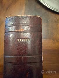antico volume sul lavoro con rilegatura in pelle di Emile Zola. La copertina e usurata soprattutto Sugli angoli, non ha parti mancanti.