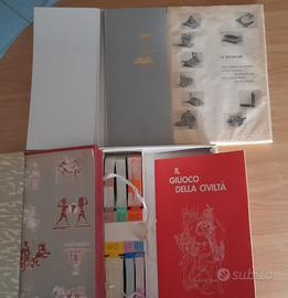 Volume scatola Il giuoco della civiltà Garzanti anno 1957, rilegato in tela con impressioni in oro e sovraccoperta a colori. Contenente 10 modellini architettonici per li studio dei vari stili e il giuoco della civiltà con 500 immagini storiche e 1000 illustrazioni in costume.