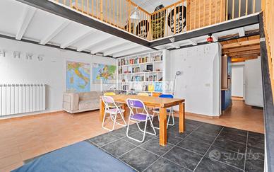 l'ingresso che conduce direttamente alla zona living, caratterizzata da un confortevole ed AMPIO DIVANO, tavolo a cinque posti e libreria che completa l'arredamento. La SCALINATA in legno che ci accompagna nella zona soppalcata e ci conduce agli spazi più intimi dell'appartamento: tra cui il bagno e la camera da letto finestrata con affaccio sul cortile interno.