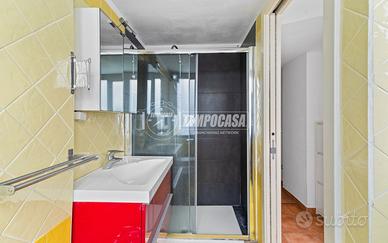 proseguendo, il disimpegno ci porta al SECONDO BAGNO, finestrato e caratterizzato da un doppio BOX DOCCIA IN CRISTALLO, sanitari appoggiati e LAVATRICE.