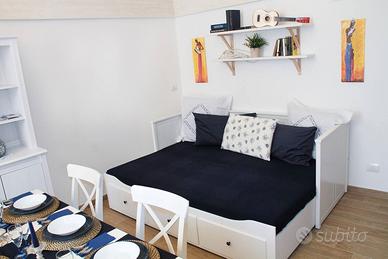 Affittasi per brevi periodi, appartamento di 55 metri quadri, appena ristrutturato, indipendente, primo piano con balcone, situato a 50 metri dalla piazza centrale appena fuori dalla movida del centro storico e a soli 500 metri dal mare, interamente arredato e completo di ogni genere di confort (lavatrice, forno, piano cottura, microonde, aria condizionata, termosifoni, Smart TV in ogni camera, wi-fi, stoviglie, piatti...) con 6 posti letto, composto da stanza da letto matrimoniale, soggiorno-cucina con divano letto matrimoniale più letto singolo, bagno con doccia e terrazza attrezzata. Possibilità di culla e seggiolone. Gradito contatto telefonico. Possibilità di ospitare fino a 12 persone in 2 appartamenti comunicanti.