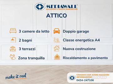 (Riferimento: BR-294-RV) Pordenone (Rif. BR-294-RV) NUOVA COSTRUZIONE | POSSIBILITÀ SISMABONUS | 3 CAMERE DA LETTO | 2 BAGNI ENTRAMBI FINESTRATI | 3 GRANDI TERRAZZI | DOPPIO GARAGE DI CIRCA 40MQ | TERMOAUTONOMO | OTTIMA ESPOSIZIONE | CAPPOTTO TERMICO | RISCALDAMENTO A PAVIMENTO | CLASSE ENERGETICA A4 | PANNELLI FOTOVOLTAICI CONDOMINIALI In una riservata zona semicentrale di Pordenone, all'interno di un signorile ed esclusivo contesto residenziale di poche unità, proponiamo in vendita un attico di assoluto pregio, raro per caratteristiche e posizione, situato al quarto e ultimo piano di una moderna palazzina servita da ascensore. L'abitazione si distingue per la raffinata distribuzione degli spazi, l'eccellente luminosità e la perfetta fusione tra comfort ed eleganza. L'ingresso introduce a un'ampia e luminosa zona living, con accesso diretto al grande terrazzo loggiato di circa 45 mq, ideale per momenti conviviali e relax all'aperto, oltre a un ulteriore terrazzino che precede e accompagna l'ingresso alla zona notte, creando una piacevole continuità tra interno ed esterno. La zona notte, ben separata, ospita tre camere da letto, tra cui una master bedroom con bagno en-suite, oltre a un secondo bagno a servizio dell'abitazione. La camera padronale gode inoltre di accesso diretto a un ulteriore terrazzo scoperto di circa 30 mq. L'attico beneficia di una doppia esposizione angolare, che assicura luminosità naturale durante l'intero arco della giornata, ed è inserito in un contesto di assoluta quiete, pur rimanendo comodo a tutti i principali servizi cittadini. Le finiture di alto livello e le dotazioni tecnologiche confermano il carattere esclusivo dell'immobile: portoncino blindato, serramenti in PVC con triplo vetro anta/ribalta, zanzariere, alzapersiane elettrico, riscaldamento a pavimento, predisposizione per ventilazione meccanica controllata e aria condizionata canalizzata, videocitofono, cappott