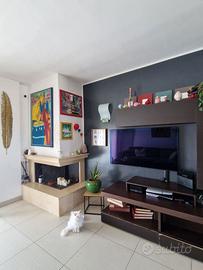 L'ingresso si apre su un luminoso soggiorno dotato di camino e zona pranzo, collegato a una cucina abitabile con penisola.