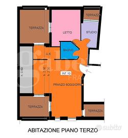 Con una superficie di 78mq la soluzione si presenta accogliente e luminosissima grazie alla tripla esposizione e le ampie finestre che danno sulle terrazze. Siamo accolti nell'ampio Salone con la terrazza a livello, il Cucinotto a vista e un comodo sottotetto altezza minima 0.60cm, disimpegno, Camera da letto, Studio/Cameretta e Bagno con doccia. Le due camere godono entrambe di uno spazio esterno.