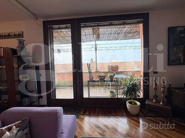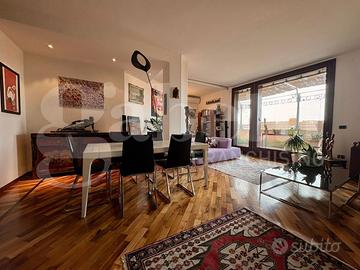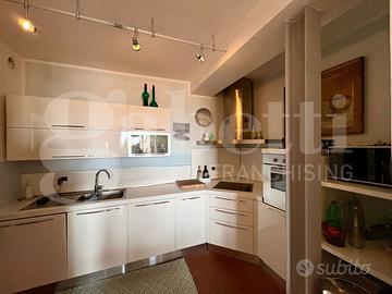 L'ingresso introduce in un disimpegno che accompagna alla zona living di ampio respiro, con zona pranzo e cucina a vista. Una spettacolare vetrata dona all'ambiente una luce naturale e conduce alla vera protagonista della casa: una magnifica terrazza privata, ampia e riservata, dalla quale si gode una suggestiva vista sui tetti del centro storico, in un contesto di assoluta tranquillità.