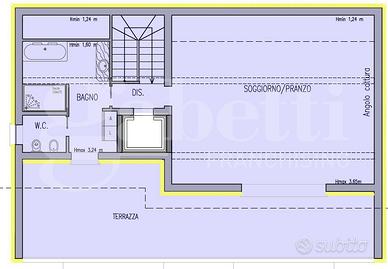 Piano attico (collegato da scala interna): ampia zona giorno con accesso alla terrazza di oltre 40 m², ampio bagno finestrato con zona lavanderia.
