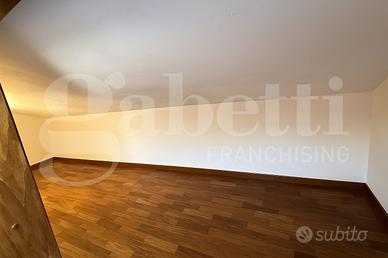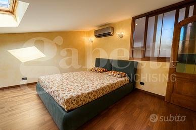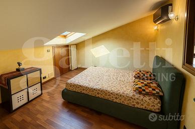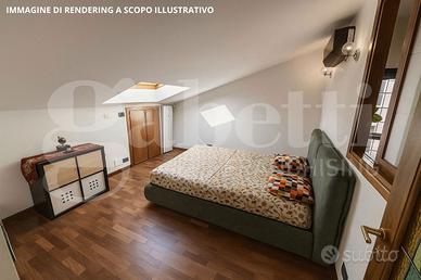 La camera da letto matrimoniale, accogliente e ben organizzata, dispone di un ripostiglio interno e di una finestra che dialoga con il soggiorno, contribuendo a rendere gli ambienti ariosi e luminosi. Il bagno, moderno e curato nei minimi dettagli, è dotato di cabina doccia idromassaggio e finestra panoramica con vista sull'Arco Alpino.
