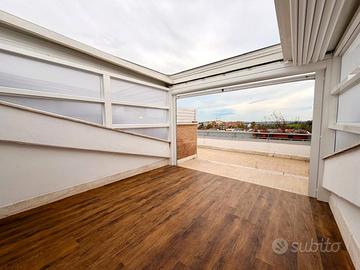 Laurentina, Quartiere Papillo, Viale Italo Calvino, all'interno del complesso residenziale "Acqua Acetosa Ostiense", proponiamo un attico mansardato confortevole e funzionale. L'immobile è composto da una cucina abitabile completamente attrezzata, una luminosa camera da letto ed un servizio finestrato. Punto di forza della casa è il terrazzo privato, attrezzato con pergotenda e climatizzazione, dove è stato ricavato il soggiorno: uno spazio piacevole e versatile, perfetto da vivere tutto l'anno come vero e proprio giardino d'inverno. Le condizioni interne sono impeccabili, trattandosi di una costruzione recente. Completano la proprietà diversi comfort: ascensore, cantina e box auto privato, che rendono questa soluzione ancora più interessante. Lo stabile è inoltre dotato di servizio di portineria, a garanzia di sicurezza e comodità. L'appartamento dispone di riscaldamento autonomo e climatizzazione in tutti gli ambienti, assicurando il massimo comfort in ogni stagione. Disponibile da subito. Solo referenziati. Tel.
