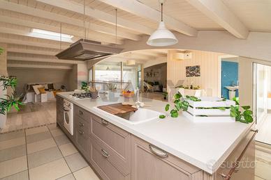 Lappartamento ha unampia zona giorno, molto luminosa e facilmente personalizzabile nella distribuzione degli spazi. L'elemento centrale è la cucina a vista con isola da show cooking, pensata per chi ama cucinare in ambienti moderni e funzionali.