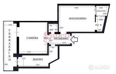 COMPOSIZIONE INTERNA: due arie di esposizione, ingresso, soggiorno con cucinino, camera da letto, ripostiglio, servizio, balcone e terrazzino. Cantina al piano seminterrato;