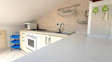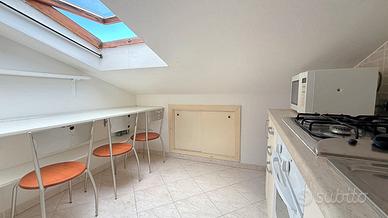 Accediamo all'immobile da un grazioso pianerottolo e troviamo un accogliente zona giorno open space con cucina riservata, l'ambiente è luminoso e ben arieggiato.