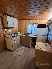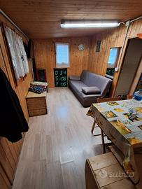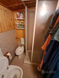 Vendesi in camping La Fasana a Bindo di Cortenova in Valsassina, bungalow in legno composto da cucina completa con lavandino, fornello e frigorifero, soggiorno con tavolo e divano letto, stufa a pellett e cassa panche, pavimento in laminato, bagno completo di doccia, bidet, lavandino e wc. Acqua calda con boiler esterno cambiato l'anno scorso. Roulotte con letto alla francese e letto singolo, armadio capiente Ikea. Totale 5 posti letto. Area esterna coperta da tettoia di circa 10mq, dove è possibile mangiare.; Barbecue in muratura. Campeggio aperto tutto l'anno con animazione estiva per Bambini e adulti. Prezzo leggermente trattabile