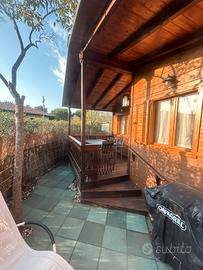 Casa mobile in pino austriaco naturale. 58 mq su due carrelli con veranda. Pareti e tetto ventilati infissi in legno pavimento parquet su piazzola recintata con posto auto esclusivo. Centralissima al Villaggio. Dotata tutti i confort con servizio igienico, cinque posti letto su due camere e aggiuntivo zona giorno, cucina completa e frigorifero aggiunto. Completamente arredata sia in interno che esterno. Prezzo comprensivo del costo stagionale per 6 persone. Villaggio che accetta tranquillamente animali.