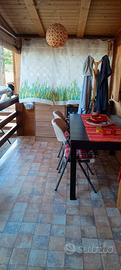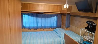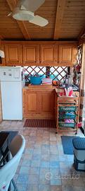 Soggiorno con TV + decoder TV/SAT e divano letto, roulotte con 2 letti singoli e TV, cameretta con letto singolo, veranda coperta con cucina attrezzata, frigo e tende in PVC.