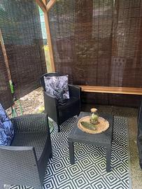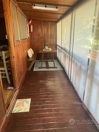 VENDO casetta in legno con roulotte, composta da piccolo spazio esterno con gazebo tavolo e panche, barbecue a gas, soggiorno con divano letto, cucina e frigorifero;