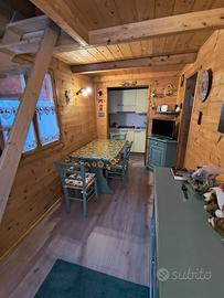 Chalet in legno con giardino, ristrutturato e arredato presso il Villaggio Gofree di Pragelato. Composizione: ingresso su soggiorno, angolo cottura, disimpegno, camera da letto, ripostiglio, bagno e mansarda, sei posti letto. Riscaldamento canalizzato ad aria alimentato a metano.