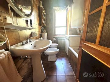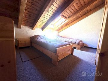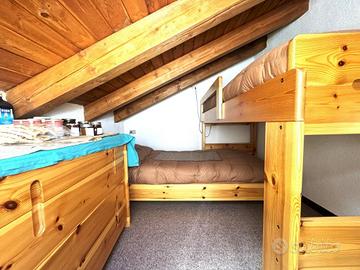 Il piano superiore, mansardato con travi a vista, ospita tre camere da letto e un secondo bagno con doccia, offrendo spazio e comfort ideali anche per famiglie numerose o per chi desidera ospitare amici.