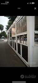 Svendo gazebo con struttura in ferro verniciato in bianco, con pendenze in falda interne mascherate esternamente da profilati regolari e squadrati.Pareti apribili con tende in teli trasparenti nella parte più alta e pannelature amovibili nella parte bassa. Praticamente il gazebo è totalmente flessibile per ogni stagione.Provvista di pedana in tavolato di legno con sotto struttura metallica di sostegno. Il gazebo nella sua interezza misura 10 mt x 3mt.