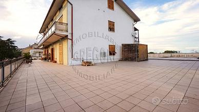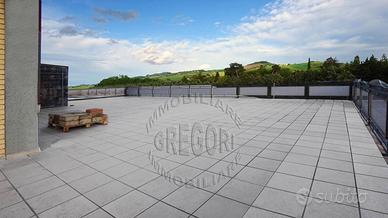 (192427444) - L'agenzia immobiliare Gregori propone in vendita grande appartamento con gigantesco terrazzo e mansarda, situato nella di Campiglione di Fermo, nella rinomata località Triangolo. Quest' area è nota per il facile collegamento con le principali località come Porto San Giorgio, Fermo, Porto Sant'Elpidio, e per essere una zona ricca di servizi, compreso un centro commerciale ed il nascente nuovo ospedale della provincia. L'immobile si trova al primo piano di una palazzina composta da sole due unità immobiliari, che garantiscono bassissime spese condominiali, nonché tranquillità e privacy. Questa eccezionale proprietà offre una superficie abitabile di 200 metri quadrati su un unico livello, arricchita da un terrazzo panoramico a 360 gradi di ben 500 metri quadrati, perfetto per ospitare eventi, momenti di relax all'aperto o per creare un giardino pensile; completa la proprietà una mansarda sottotetto a servizio dell'abitazione. La palazzina gode di corte privata destinata a parcheggio dei condomini. L'abitazione si compone di: imponente soggiorno, cucina abitabile con mobile ad isola, tre grandi camere matrimoniali, una cameretta, due bagni finestrati di cui uno con vasca idromassaggio, un ripostiglio, nonché una immancabile stanza lavanderia; si evidenzia che i bagni sono stati recentemente ristrutturati, tutte le stanze hanno una ampia metratura, ma soprattutto che tutti gli ambienti hanno accesso diretto al terrazzo. Arricchisce la proprietà una mansarda sottotetto recentemente ristrutturata ad uso "rustico" per conviviali cene con gli amici o mini appartamento. Ape "F". L'abitazione ha esposizione su quattro lati ed oltre a beneficiare di ottima luminosità per tutto l'arco della giornata, gode anche di ottima vista aperta verso il verde delle colline. Immobile è ideale per chi è alla ricerca di grande superficie abitativa completa d - Classe: F - IPE: 175.00 kWh/mq anno