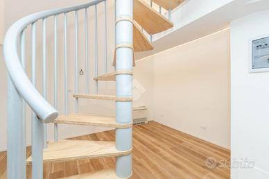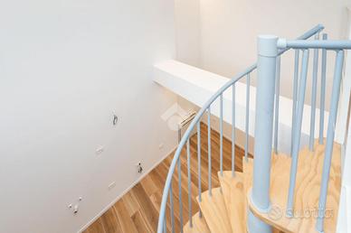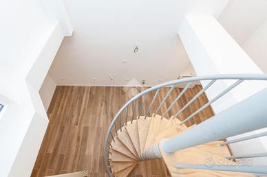 Un comodo ripostiglio completa il livello principale, mentre una scala di design conduce al soppalco, dove trovano spazio la camera da letto matrimoniale, una cabina armadio su misura e un bagno finemente rifinito.