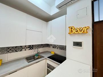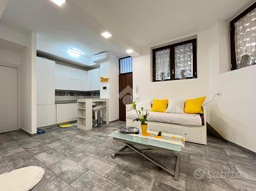 L'appartamento si compone di ingresso su ampia zona living con angolo cottura a vista, disimpegno e bagno con box doccia. Il piano cottura è a induzione e lo scaldabagno è elettrico, eliminando l'utenza personale del gas.