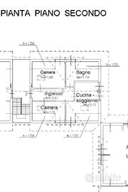 L'alloggio, sito al secondo piano, senza ascensore, è composto da ingresso sul disimpegno, soggiorno con cucina a vista, camera da letto, cameretta e bagno con vasca.