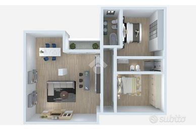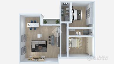 La soluzione è formata da due unità immobiliari distinte con possibilità di creare un unico appartamento di tre locali formato da: soggiorno con cucina a vista, disimpegno, due bagni di cui uno finestrato e due camere di cui una matrimoniale.