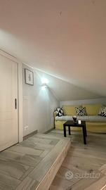 L'appartamento è situato al quarto piano di un condomino privato, raggiungibile tramite scale o ascensore. Arrivati in appartamento, ci sono delle scale che conducono al primo salottino con divano letto. Aperta la porta, vi è il salotto, con sala da pranzo e cucina in un unico ambiente. Il divano è praticamente un grande letto a tre piazze in cui è possibile sia dormire, sia trascorrere la giornata.