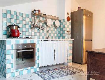 La cucina, funzionale e con il suo caratteristico rivestimento a scacchiera bianco-azzurro, è equipaggiata con elettrodomestici Whirlpool e un capiente frigorifero Ariston.