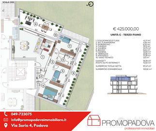 Rif:356_G (2904521_1) - Padova zona Chiesanuova - OTTIMO CONTESTO!!! Abitazioni costruite in classe energetica A4, che rispecchiano in toto le direttive in merito al risparmio energetico, con impianto fotovoltaico ed ottimo isolamento termico. Costruire in classe A4 significa: 1) Realizzare edifici a minima dispersione termica, grazie a: - isolamento a cappotto esterno, con particolare cura ai ponti termici; - utilizzo di finestrature in legno, ad alto isolamento termico; 2) Installare impianti tecnologici evoluti ad alta efficienza energetica: - impianto di climatizzazione invernale/estiva; - ventilazione meccanica controllata; - impianto fotovoltaico PAROLE CHIAVE PER LA TUA CASA SU MISURA: - COMFORT ABITATIVO DI QUALITA' - RISPARMIO ENERGETICO - PIENA FRUIBILITÀ DEGLI SPAZI Ogni unità è dotata di impianto di riscaldamento a pavimento e impianto di raffrescamento entrambi in Pompa di Calore, impianto Fotovoltaico autonomo per ogni unità, sistema di ventilazione controllata, impianto di allarme, sanitari sospesi, automazione garage e accesso carraio motorizzato. È previsto un impianto elettrico domotico che consente la gestione del controllo carichi, dei consumi e del sistema anti-intrusione. Le scelte delle finiture interne sono a discrezione del cliente (in base ad un capitolato di alto livello), come anche la distribuzione interna degli ambienti in caso di acquisto in costruzione. Tutti gli appartamenti hanno un garage ed un posto auto scoperto inclusi nel prezzo. PIANO TERZO --- ATTICO Attico G - € 425.000 - 153 mq commerciali Soggiorno con angolo cottura di 42 mq, terrazza abitabile di 22 mq., tre camere (mq.: 11, 13, 15), un poggiolo, doppi servizi. Molto luminoso (esposto est/sud/ovest) Riferimento agenzia numero 356, Telefono agenzia 049-72.30.75; nume - Classe: A4